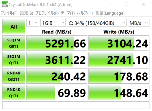 両者でベンチマークをとってみました。なおOS起動ドライブであるCドライブで利用しているため実使用環境でのスピードです。